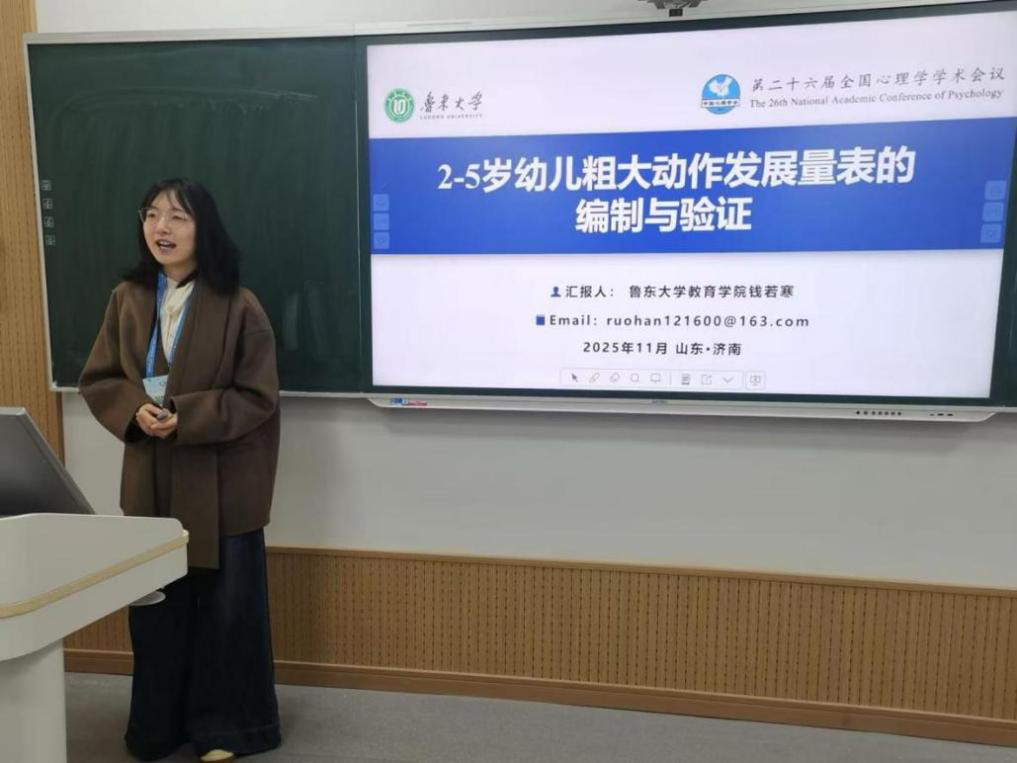 我院学前教育专业2023级硕士研究生钱若寒同学在“发展心理专业委员会”分会场作了题为《2-5岁幼儿粗大动作发展量表的编制与验证》的口头报告。从选题依据、研究方法、研究结果和结果讨论四个方面探讨了2-5岁幼儿粗大动作发展评估量表的编制与验证过程,并与参会学者就量表的校标关联效度、条目施测流程等问题展开了深入讨论。多位专家对研究成果的实际应用潜力予以认可。