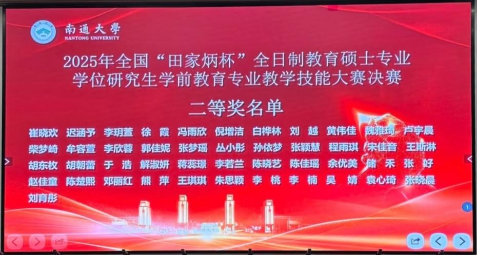 本次赛事由全国教育硕士专业学位指导委员会指导、田家炳基金会冠名、南通大学主办,共有86所院校的221名选手参赛。决赛最终产生一等奖22人,二等奖45人,三等奖66人,优秀教学设计奖86人。2025年全国“田家炳杯”全日制教育硕士专业学位研究生教学技能大赛自5月启动,包括初赛和决赛两个阶段:初赛采用线上形式进行,竞赛内容包括教学设计、教学视频两项内容;决赛以线下形式进行,竞赛内容包括活动设计、现场说课和现场活动模拟。该赛事是教育硕士目前国内层次最高、规模最大、影响力最广的技能竞赛,其旨在推进师范生教学实践能力的提升,培养一批具有高尚师德、先进教学理念、扎实教学技能的优秀教师后备力量。