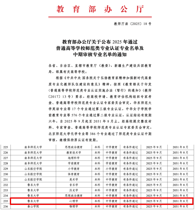 9月25日,教育部办公厅正式发布《关于公布2025年通过普通高等学校师范类专业认证及认证中期审核专业名单的通知》。我院心理学专业通过师范类专业第二级认证,认证结论有效期为6年(2025年9月至2031年8月)。至今,我院三个本科专业已全部通过教育部师范类专业第二级认证。